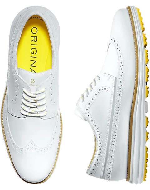 Tee off in style with these wingtip golf Oxfords from Cole Haan. This legendary shoe features cushioning technology to guarantee you keep comfy for all 19 holes. A weather-ready upper stays dry even when conditions become inclement, while underfoot multidirectional traction provides a sure-footed grip on slick surfaces.