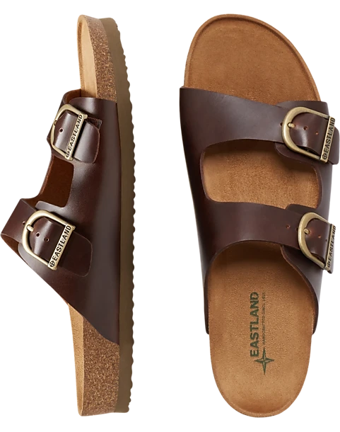- Genuine leather upper|Open toe|Slip on with two adjustable buckle closures|Padded footbed with Active Memory Foam|Fabric lining|TPR and cork midsole|EVA sole|Eastland|
