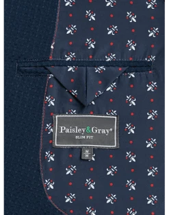 - 65% polyester 35% rayon|Two button|Notch lapel|Side vents|Slim Fit|Paisley & Gray|