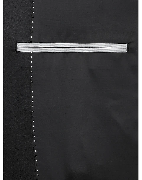 - 87% polyester 11% rayon 2% spandex|Two-button jacket|Shawl lapel|Side vents|Flat-front slacks|Finished hem
